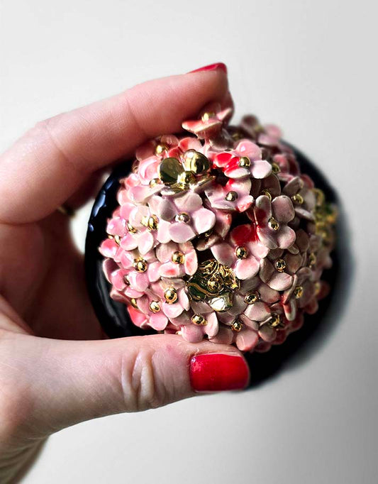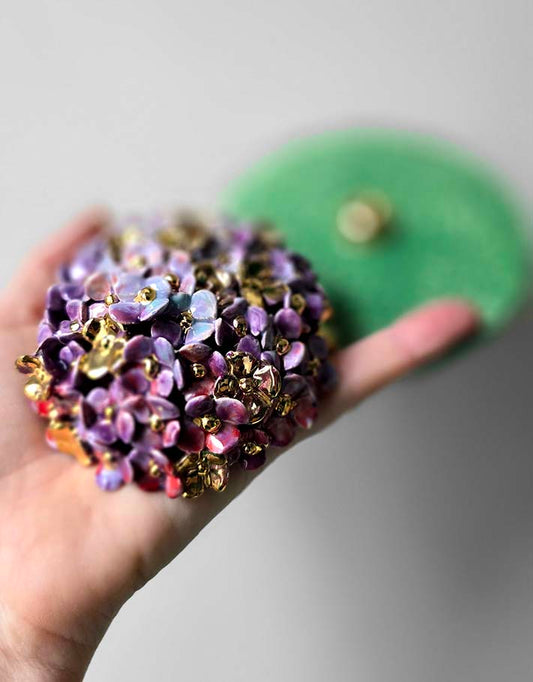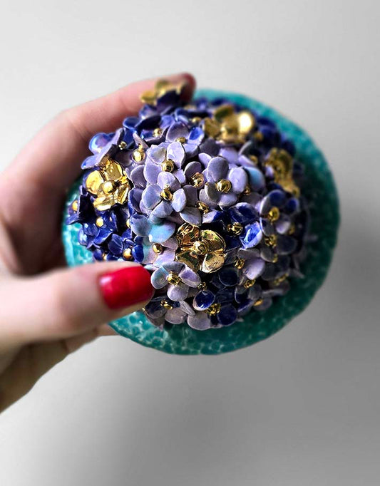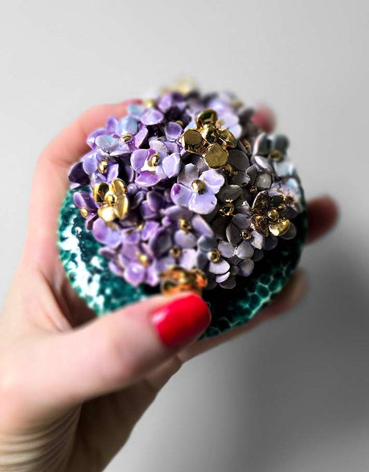 Porte encens Céramique Émaillée, Hortensias et Or - Pièce Unique Fait Main