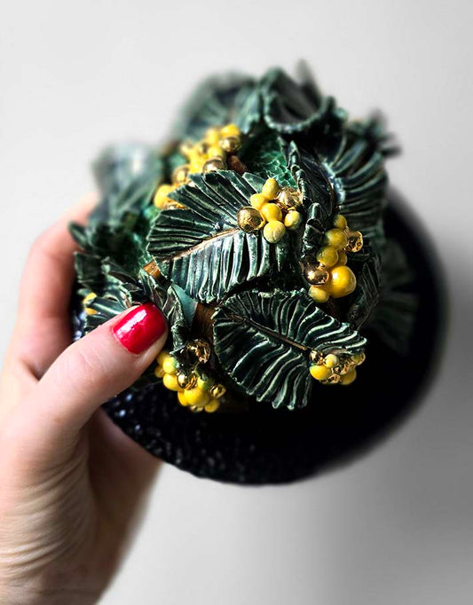 Porte encens Céramique Émaillée, Mimosa et Or - Pièce Unique Fait Main