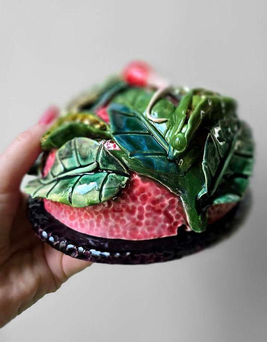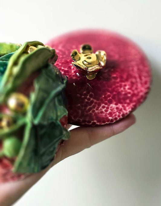 Porte encens Céramique Émaillée, Fleurs de fraisier et Or - Pièce Unique Fait Main