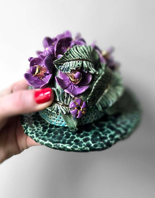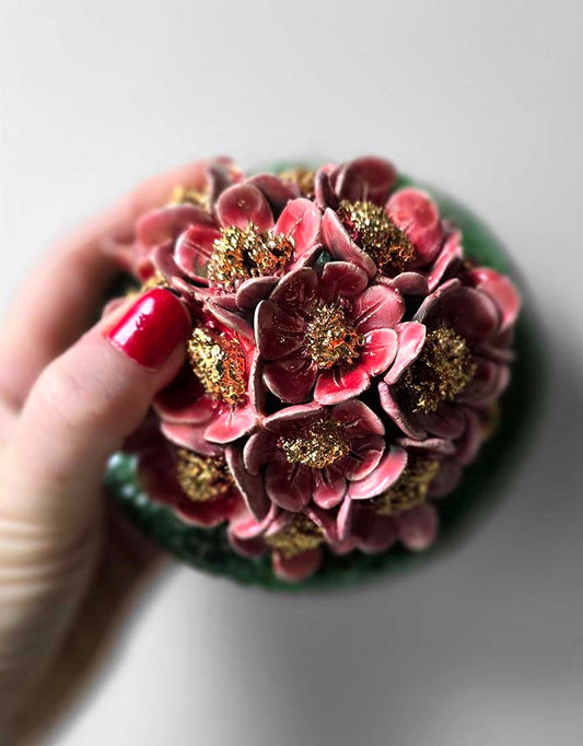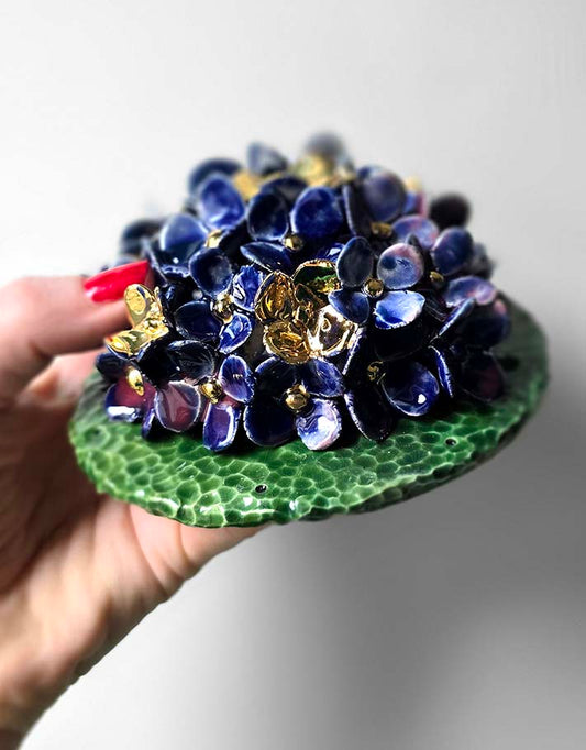 Porte encens Céramique Émaillée, Hortensias et Or - Pièce Unique Fait Main
