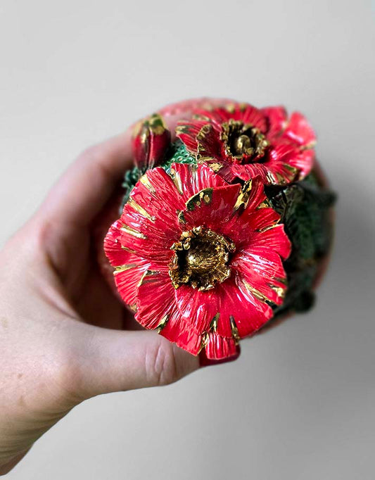 Porte encens Céramique Émaillée, Coquelicots et Or - Pièce Unique Fait Main