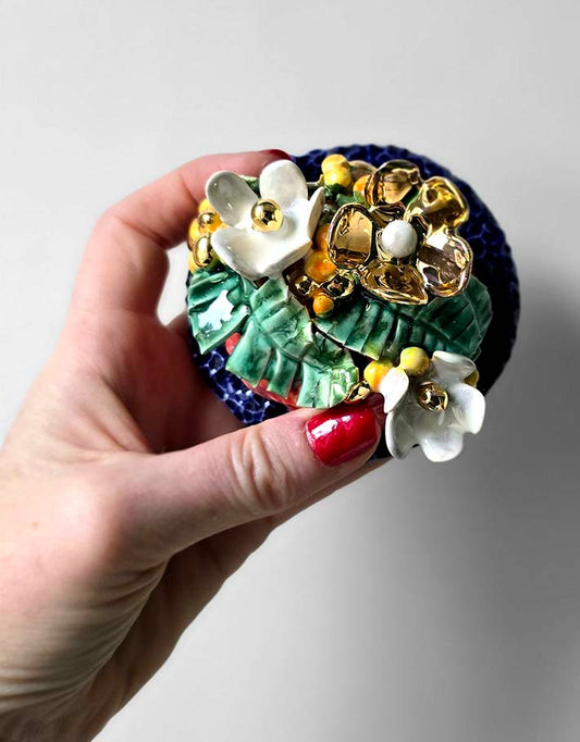 Porte encens Céramique Émaillée, fleurs blanches & mimosa - Pièce Unique Fait Main