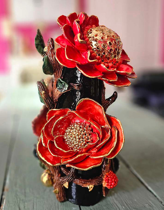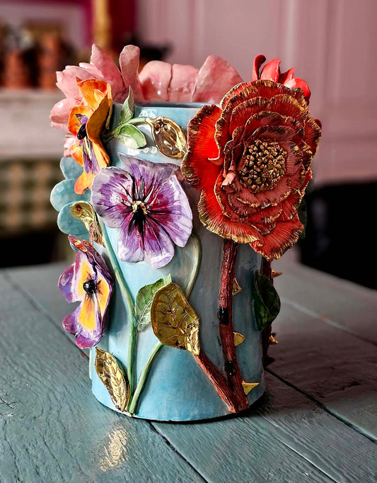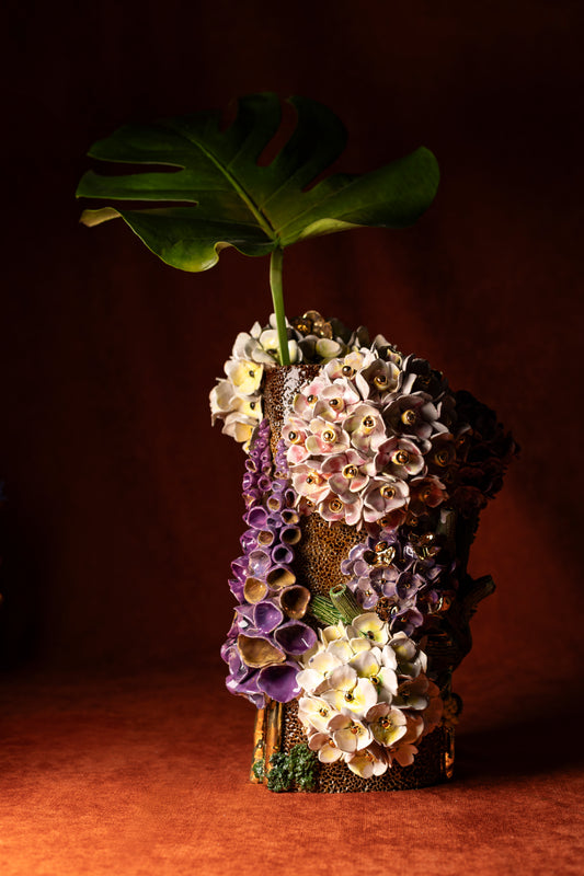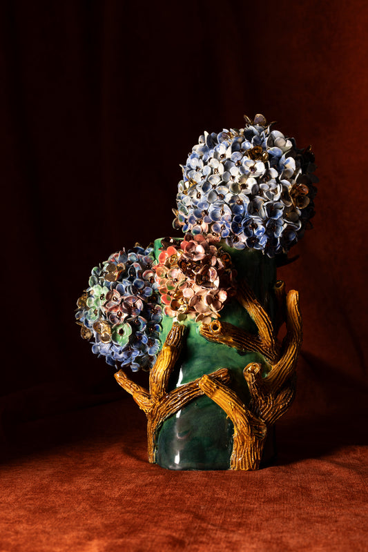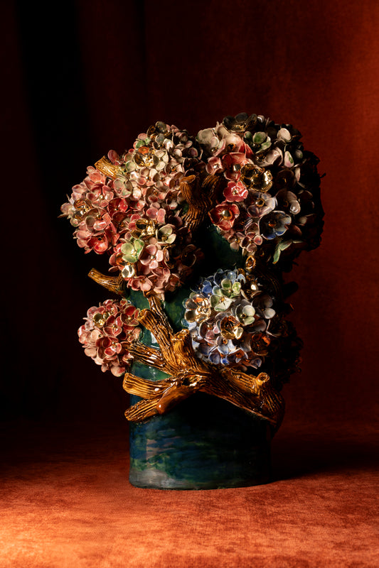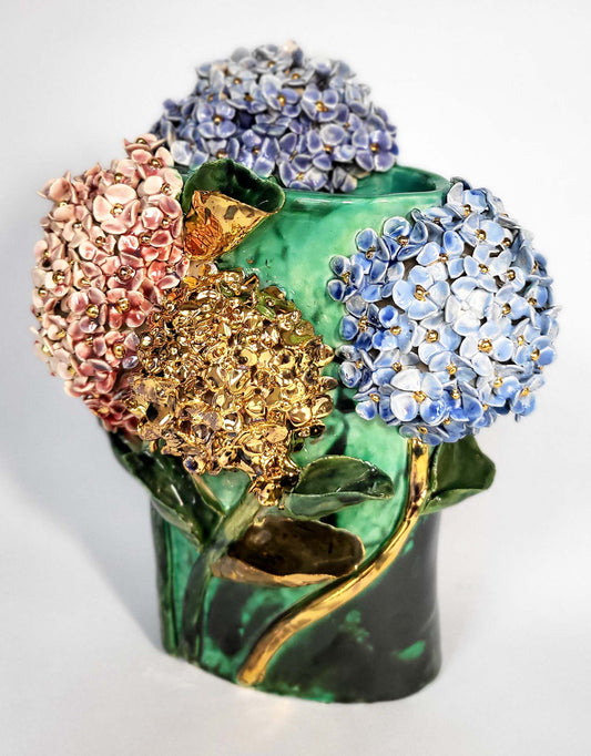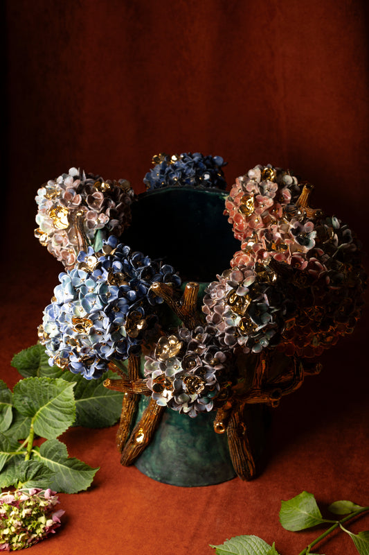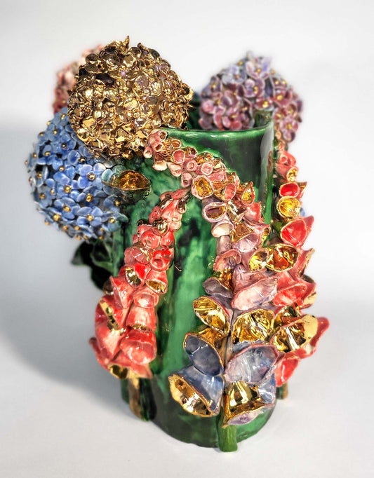 Vase Hortensia et Digitale – Pièce Unique Faite à la Main avec de l'or fin 22 carats