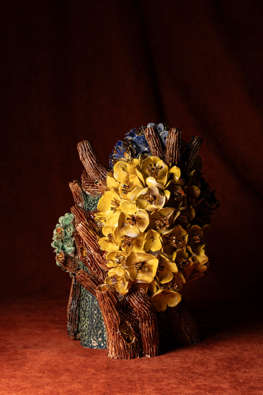Splendeur Florale en Or et Faïence - Pièce Unique Artisanale Dorée à l'Or Fin