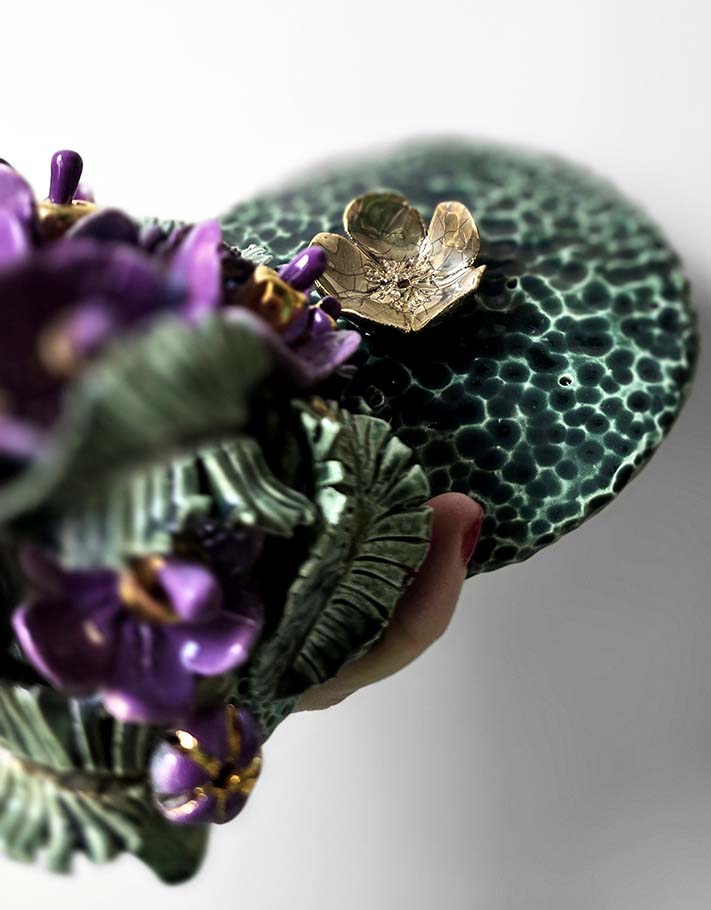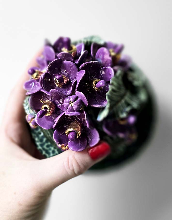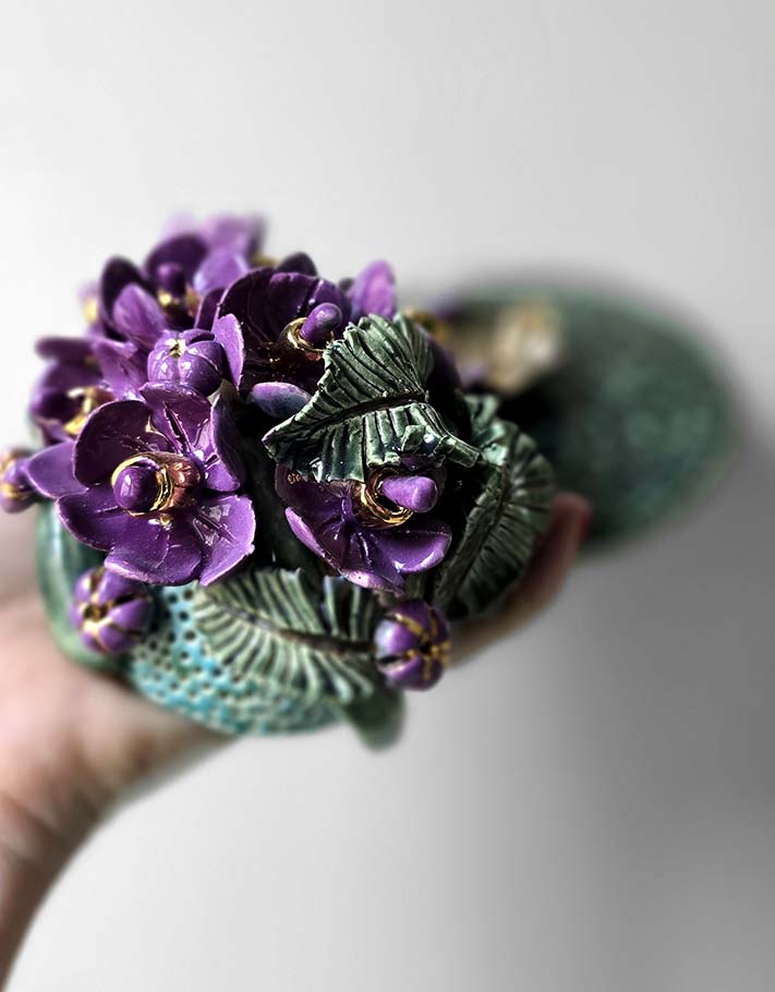 Porte encens Céramique Émaillée, Pensées et Or - Pièce Unique Fait Main